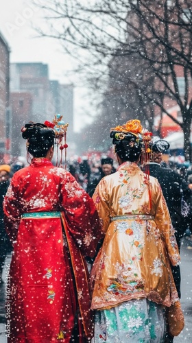 Parade participants dressed in traditional Chinese clothing for New Year.