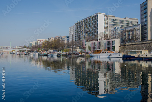 Paris, Bastille, harbor, houseboats and view on statue