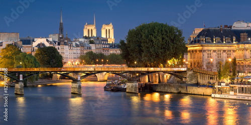Paris evening summer view toward Ile de la Cite with the Pont des Art and Seine River banks (World Heritage UNESCO site). Illuminated monuments in the 1st and 6th Arrondissements. France