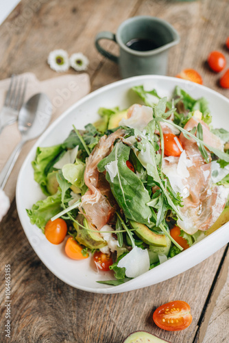 Parma ham salad served in a white plate