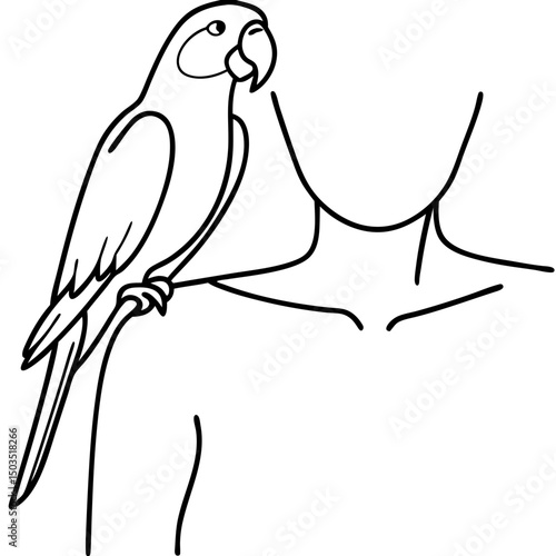Parrot perched on a shoulder, line art illustration, black and white, for designs