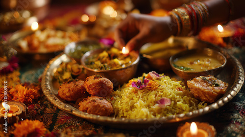 Partial Hands Offering Flowers onto Bhog Plate