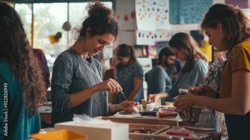 Participants collaborate on art projects at a community center, using various materials and techniques to express their creativity.