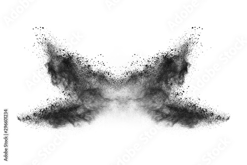 Particles of charcoal on white background,abstract powder splatted on white background,Freeze motion of black powder exploding or throwing black powder.