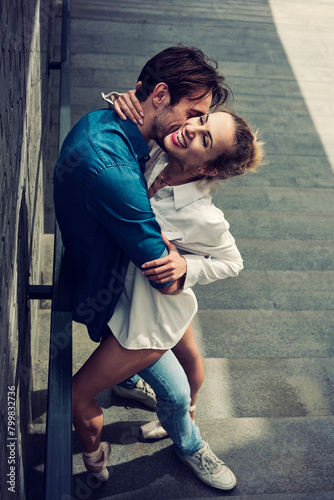 partner in love hugs a ballerina on the city stairs while walking around the city on a summer day