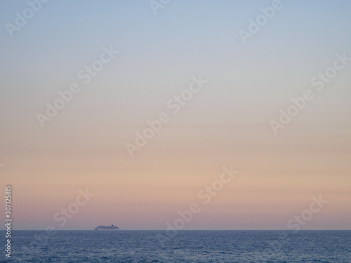 Passenger liner away on the horizon in the ocean.