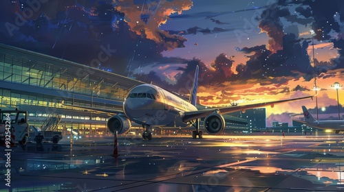 Passengers and staff bustle around a lively airport as a plane sits ready under a stunning orange and purple sunset backdrop