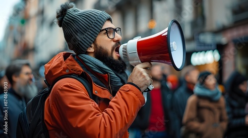 Passionate Activist Addressing Climate Change Rally Crowd with Megaphone