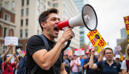 Passionate rally speaker shouting with megaphone in urban setting, activism