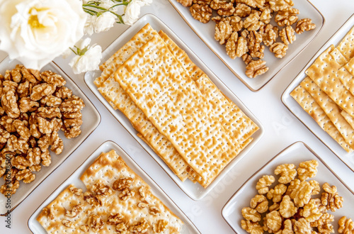 Passover celebration composition with wine, matzah, white roses, and walnuts