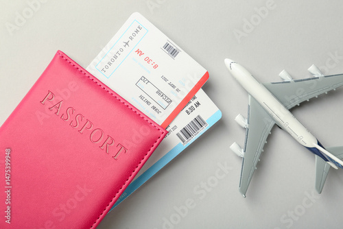 Passport with tickets and plane model on light background, top view