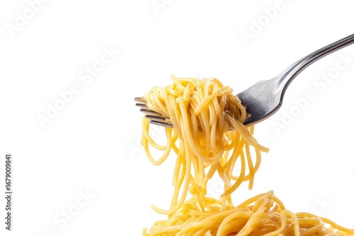Pasta strands piled on a fork against a white backdrop
