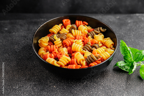 pasta trottole tricolor pasta spiral dish twisted Italian food tasty snack fresh delicious gourmet food background on the table rustic top view copy space vegan and vegan food