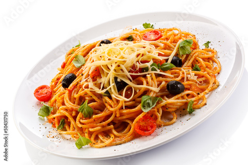 Pasta with meat, tomato sauce, parmesan and vegetables