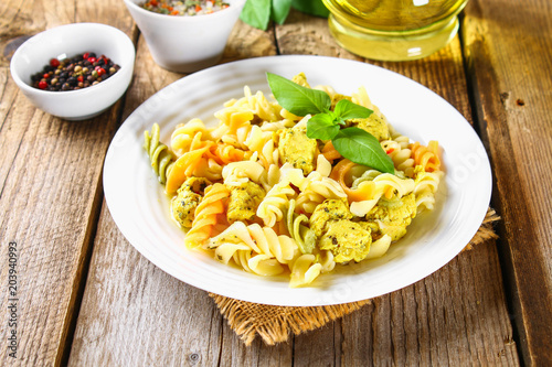 Pasta with slices of fried chicken fillet on an old wooden table.