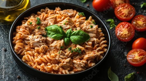 Pasta with tuna in tomato sauce, garnished with fresh basil