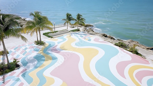 Pastel Abstract Coastal Pathway Design Ocean View Palm Trees Summer Vibe