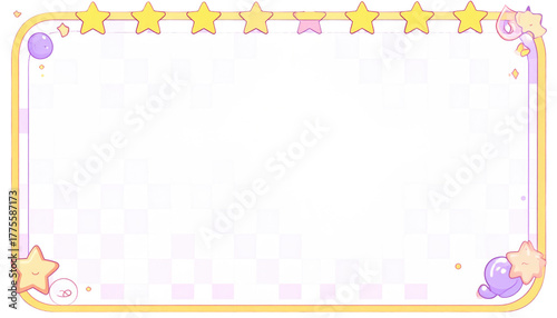 Pastel, cartoon border featuring stars and bubbles, with a checkered background, creating a whimsical, lighthearted feel