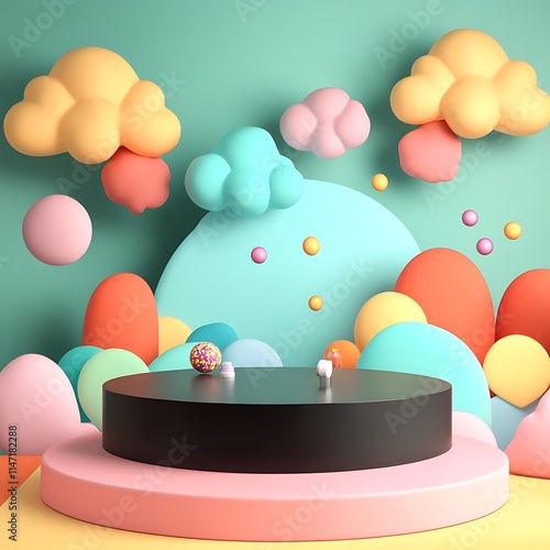 Pastel Cloudscape Display Featuring a Black Cylinder Platform
