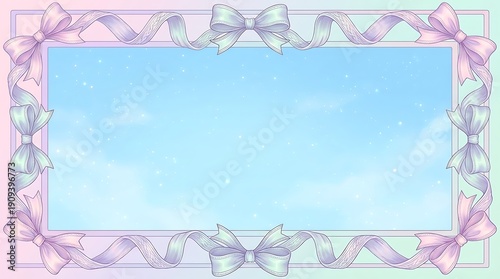 Pastel colored bow frame with blue sky and clouds background for graphic design blank template
