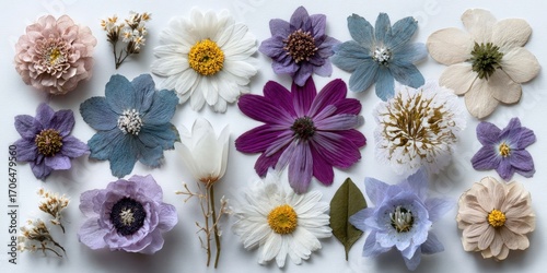 Pastel Floral Flat Lay with Pressed Flowers on White Background