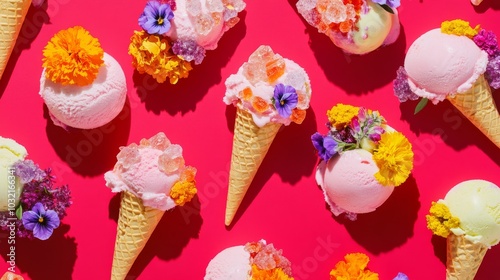 pastel ice cream cones adorned with crystallized violets and marigolds, arranged in a playful pattern against a vibrant crimson backdrop, channeling pop art aesthetics
