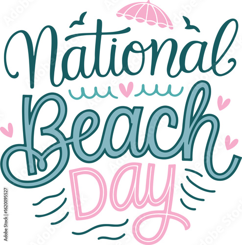 Pastel National Beach Day Lettering with Umbrella & Waves