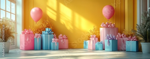 Pastel Presents and Balloons in a Sunny Room