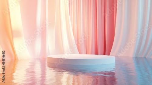 Pastel Product Display Podium Amidst Drapery, Sunlight Streaming Through