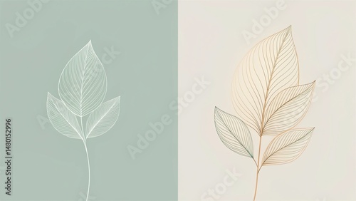 Pastel Spring Leaves Line Art Minimalist Illustration - Copy Space Right