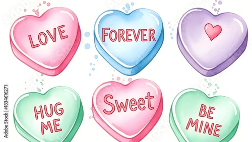Pastel watercolor conversation heart candies with loving messages like love, forever, sweet, hug me, be mine, for valentine's day celebrations
