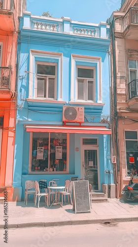 Pastel-Colored Building with Outdoor Cafe, Sunny Day Delight, Charming Shop with Tables and Chairs under Awning, Serving Refreshments Cheerfully.