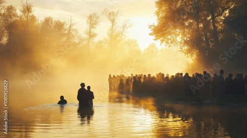Pastor Baptizing a Convert in a Misty River at Sunrise