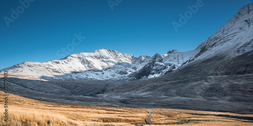 Path and winter scenery in the mountains - snow covered rocky summits of Cuillins in Glenbrittle, Isle of Skye, Scotland
