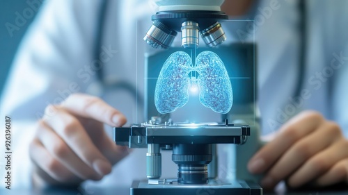 Pathologist analyzing lung tissue biopsy under a microscope, focusing on the cellular diagnosis of lung cancer