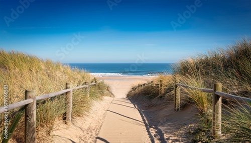 pathway through sand dunes leading to sunny beach with clear blue sky and ocean