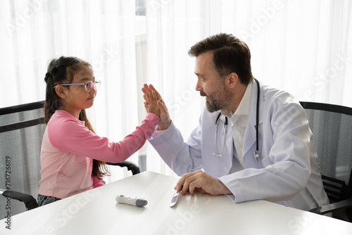 Patient Asia kid girl meeting and hi five caucasian doctor at hospital