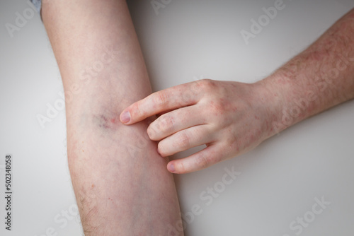 Patient showing syringe injection mark on arm with reddness and blue vein. Allergic reaction with red rash side-effect from vaccine