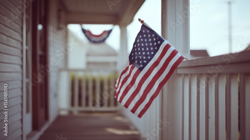 Patriotic American Flag Displayed on a Porch Railing in a Residential Neighborhood.