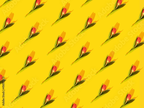 pattern made with fresh red tulips and green leaves on yelow easter background. minimal flat lay. creative background