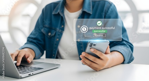 Payment successful notification on smartphone and laptop for online banking transactions concept