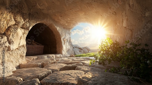 Peaceful Cave Entrance with Sunlight Streaming Through, Stone Pathway, Lush Greenery, and Warm Atmospheric Light Enhancing Natural Beauty and Tranquility