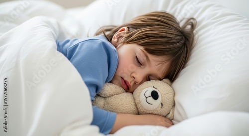 Peaceful Child Asleep with Teddy Bear, Snuggled in Soft Bedding