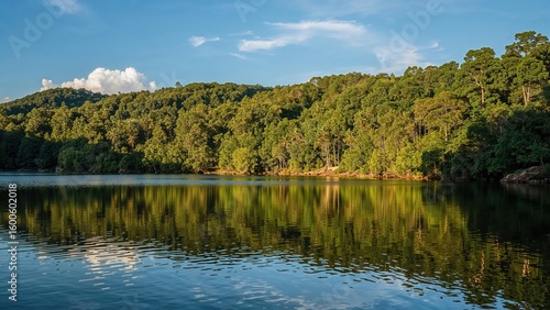 Peaceful lake surrounded by lush greenery