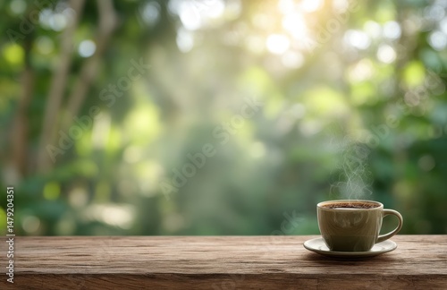 Peaceful outdoor scene with steaming coffee cup.