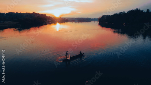 Peaceful River Landscape with Fishermen and Golden Morning Sky