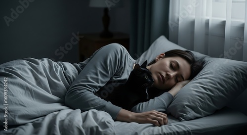 Peaceful Sleep: Woman and Black Cat Napping Together in Bed