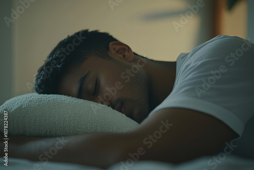 Peaceful Sleeping Man Resting in Comfortable Bed, Symbolizing Relaxation, Nighttime Tranquility, and Serenity for Health and Wellbeing Concepts