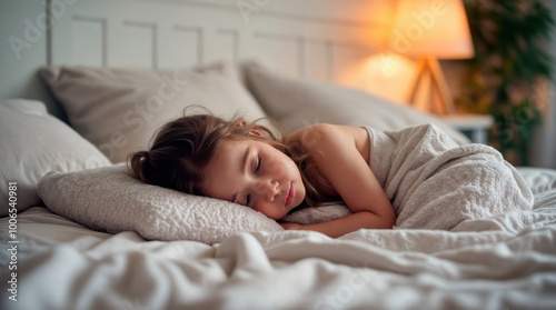 Peaceful young girl napping on cozy bed, wrapped in soft blanket, warm ambient lighting from bedside lamp, tranquil bedroom atmosphere