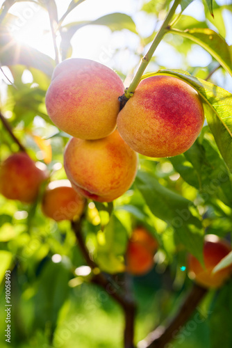 Peach branch with ripe fruit in sunlight, peach tree